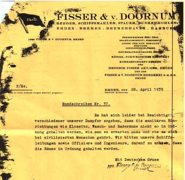 This document was discovered on the wreck in 1988 by Tor-Ola G Olsen and Torry Larsen. It results from an inspection of the vessel in 1939. Roughly translated it reads: "Instruction No 37..........the sanitary condition pertaining to toilets, washing sinks, and showers is in such a state that they are not fit for civilised people..........." It can't have been a nice vessel to work on at that time. Linkshttp://home.online.no/~r-li-lar/Konsul_Carl_Fisser_eng.htm |